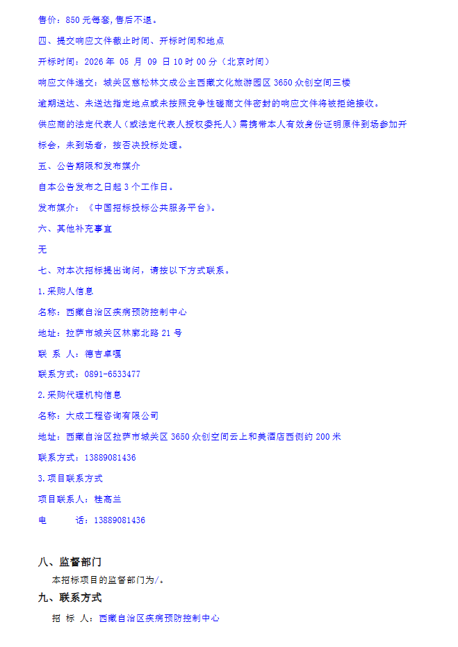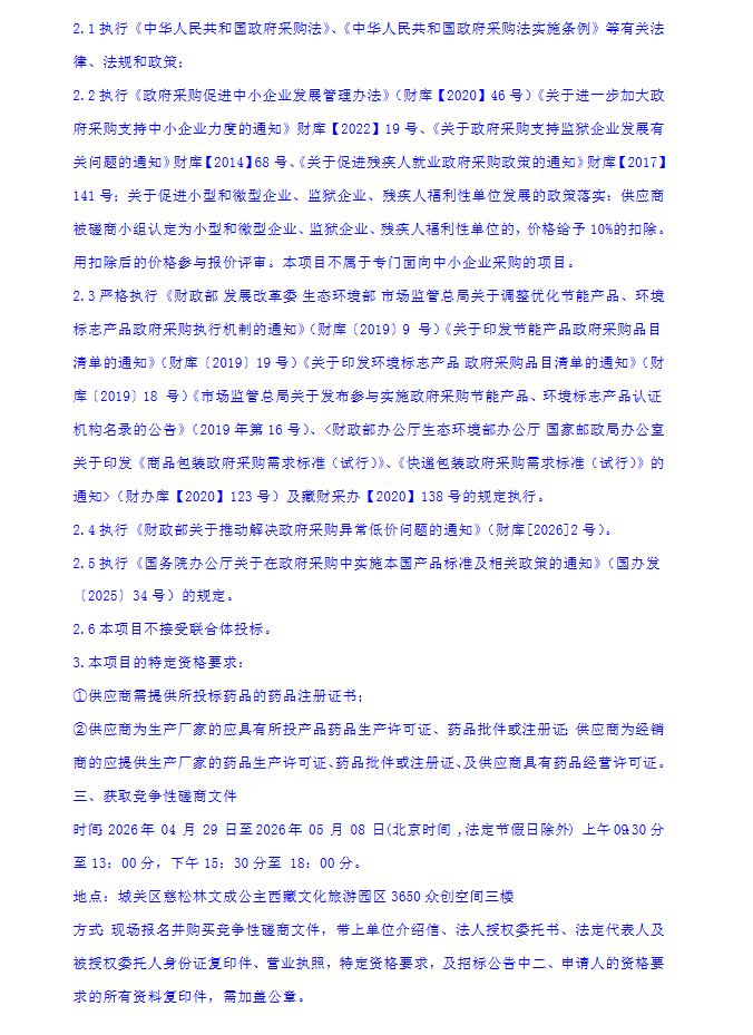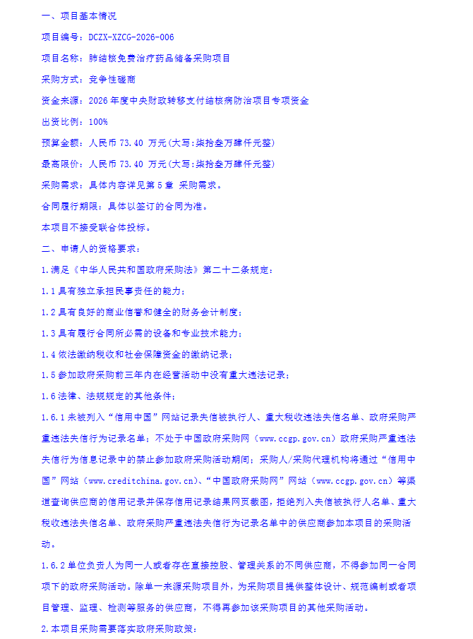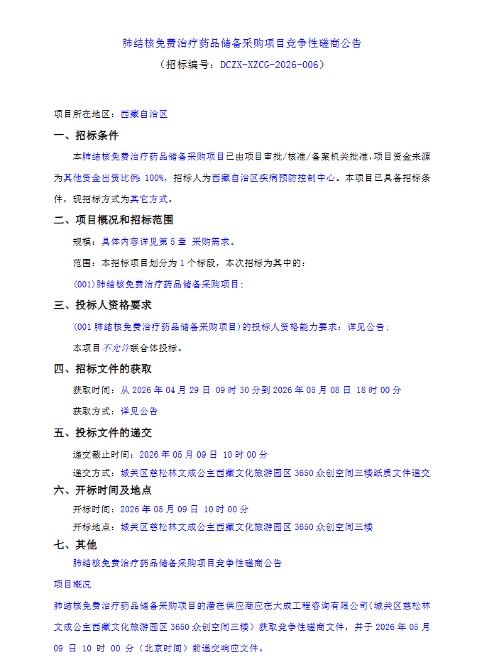 【西藏自治区疾病预防控制中心】西藏自治区疾病预防控制中心肺结核免费治疗药品储备采购项目竞争性磋商公告