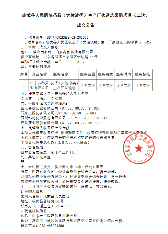 【菏泽市成武县人民医院】山东省菏泽市成武县人民医院药品(大输液类)生产厂家遴选采购项目(二次)成交公告