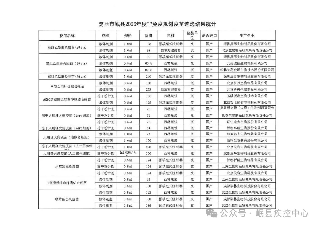 【定西】定西市岷县2026年度非免疫规划疫苗遴选结果公示