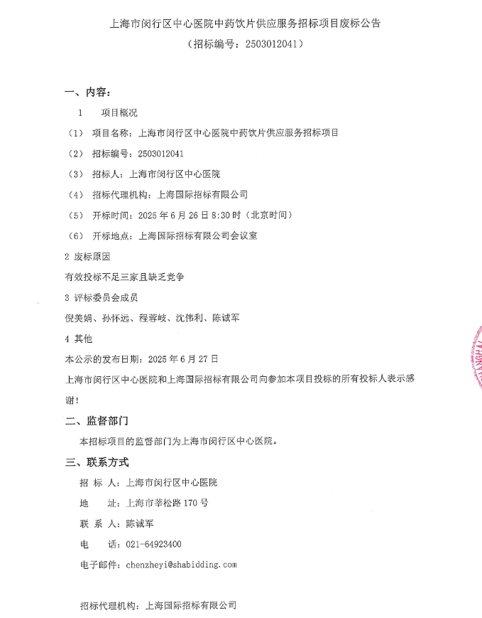 【上海市闵行区中心医院】上海市闵行区中心医院中药饮片供应服务招标项目废标公告