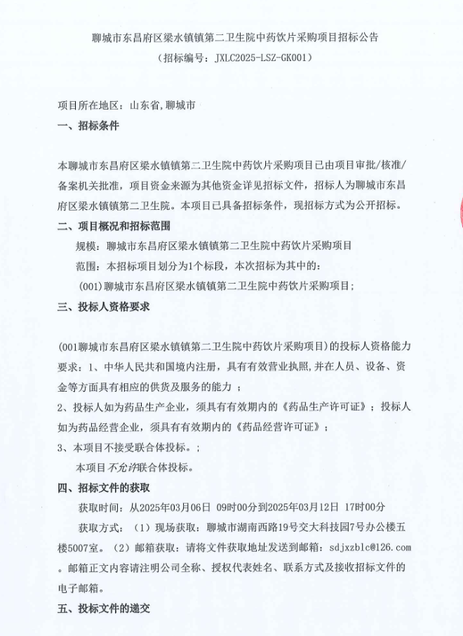 【聊城市东昌府区梁水镇镇第二卫生院】山东省聊城市东昌府区梁水镇镇第二卫生院中药饮片采购项目招标公告