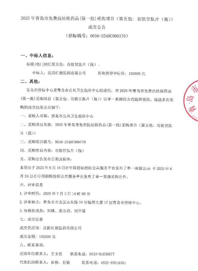【青岛市公共卫生临床中心】山东省2025年青岛市免费抗结核药品(第一批)采购项目(第五包: 谷胱甘肽片(瓶))成交公告
