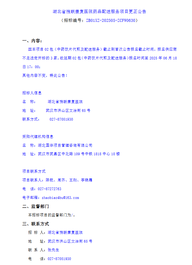 【湖北省残联康复医院】湖北省残联康复医院药品配送服务项目更正公告(20250616)