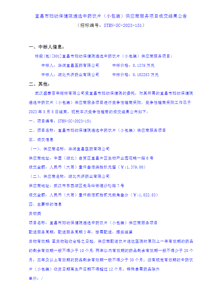 【宜昌市妇幼保健院】湖北省宜昌市妇幼保健院遴选中药饮片(小包装)供应商服务项目成交结果公告