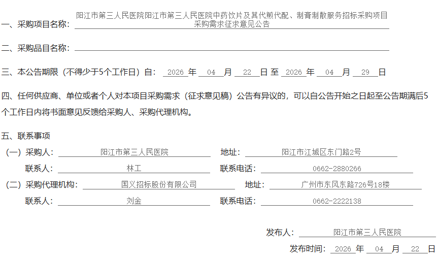 【阳江市第三人民医院】广东省阳江市第三人民医院阳江市第三人民医院中药饮片及其代煎代配、制膏制散服务招标采购项目采购需求征求意见公告