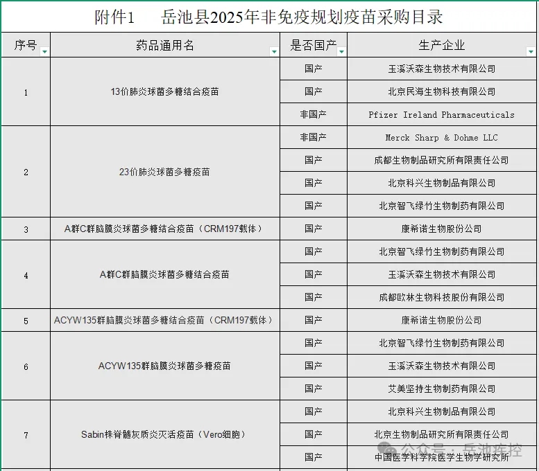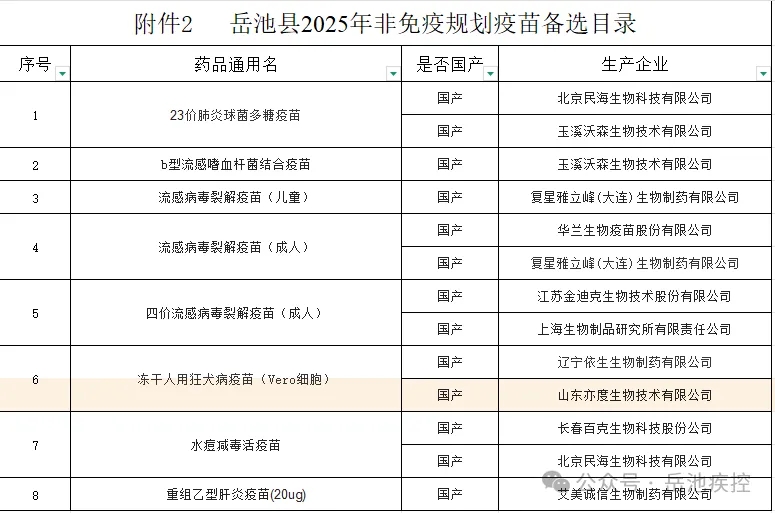 根据《岳池县卫生健康局〈关于印发岳池县非免疫规划疫苗遴选采购方案(2025年版)的通知〉》的文件要求,岳池县疾病预防控制中心组织相关人员对申报企业的资格和申报材料进行集中审核,审核内容包括申报企业的资质合法性、申报材料的完整性和真实性等。审核通过的国产疫苗只选结果排名前3位(原代和传代狂犬病疫苗一共选择5位,其中原代和传代狂犬病疫苗带VVM标签单独选择1位)、同一品种进口疫苗只选排名第1位的疫苗上市许可持有人。现将岳池县2025年非免疫规划疫苗采购目录(见附件1)、岳池县2025年非免疫规划疫苗备选目录(见附件2)予以公示。公示期为2025年6月3日至2025年6月10日。