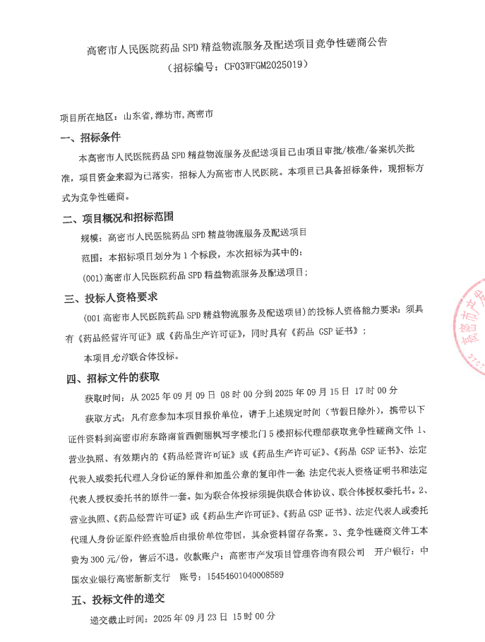 【潍坊市高密市人民医院】山东省高密市人民医院药品SPD精益物流服务及配送项目竞争性磋商公告