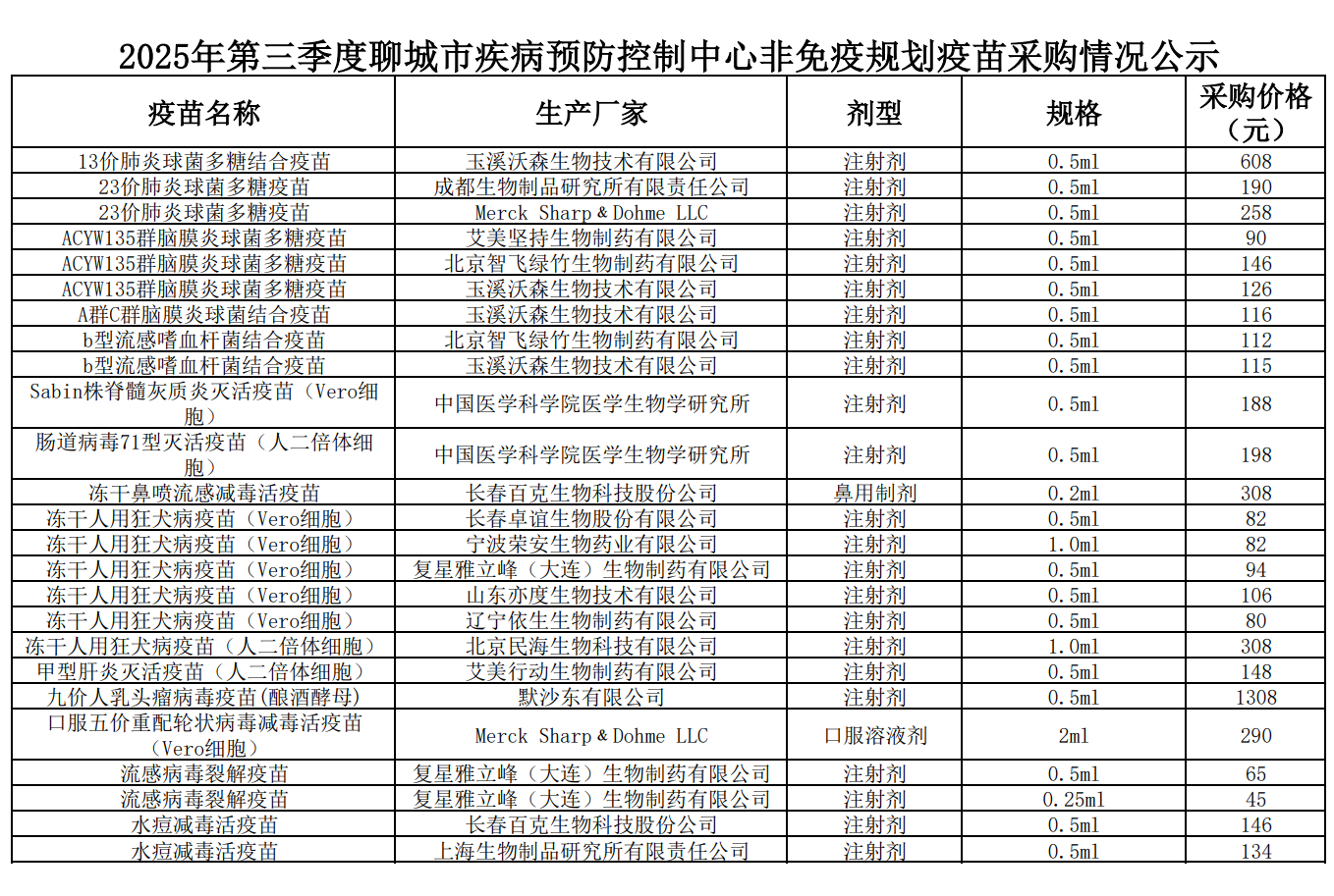【聊城】2025年第三季度聊城市疾病预防控制中心非免疫规划疫苗采购情况公示