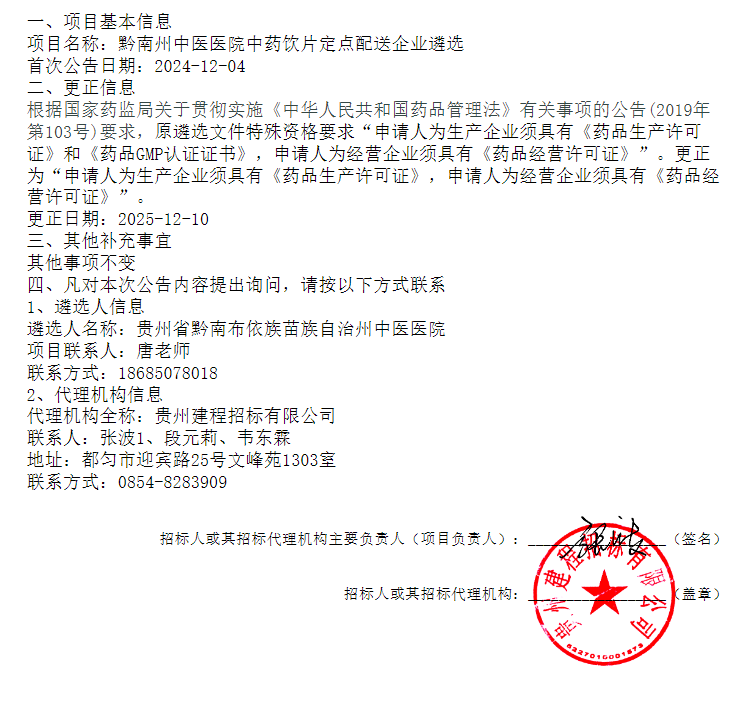 【黔南州中医医院】贵州省黔南州中医医院中药饮片定点配送企业遴选更正公告(20241210)