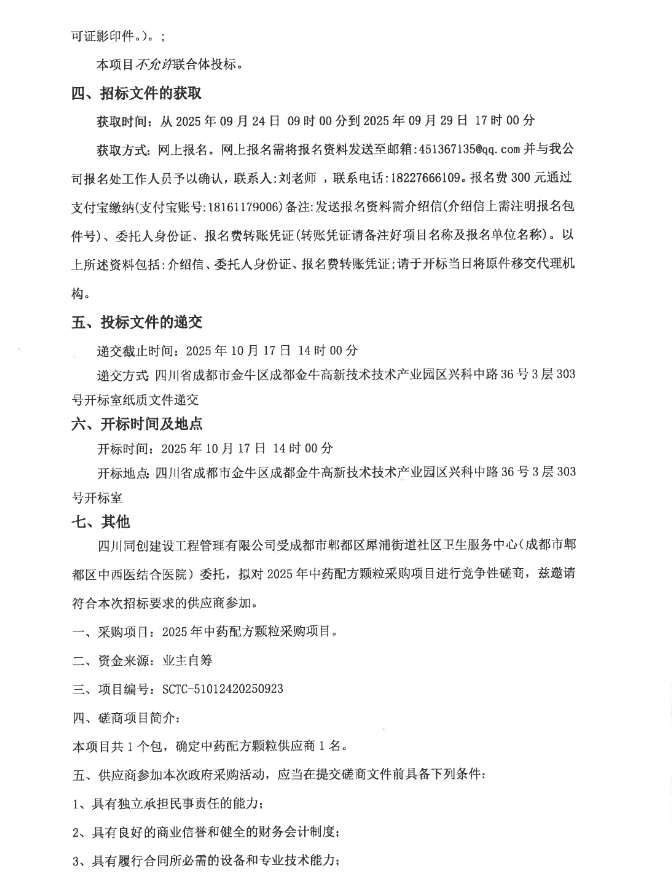 【成都市郫都区犀浦街道社区卫生服务中心】四川省成都市郫都区犀浦街道社区卫生服务中心(成都市郫都区中西医结合医院)2025年中药配方颗粒采购项目磋商邀请