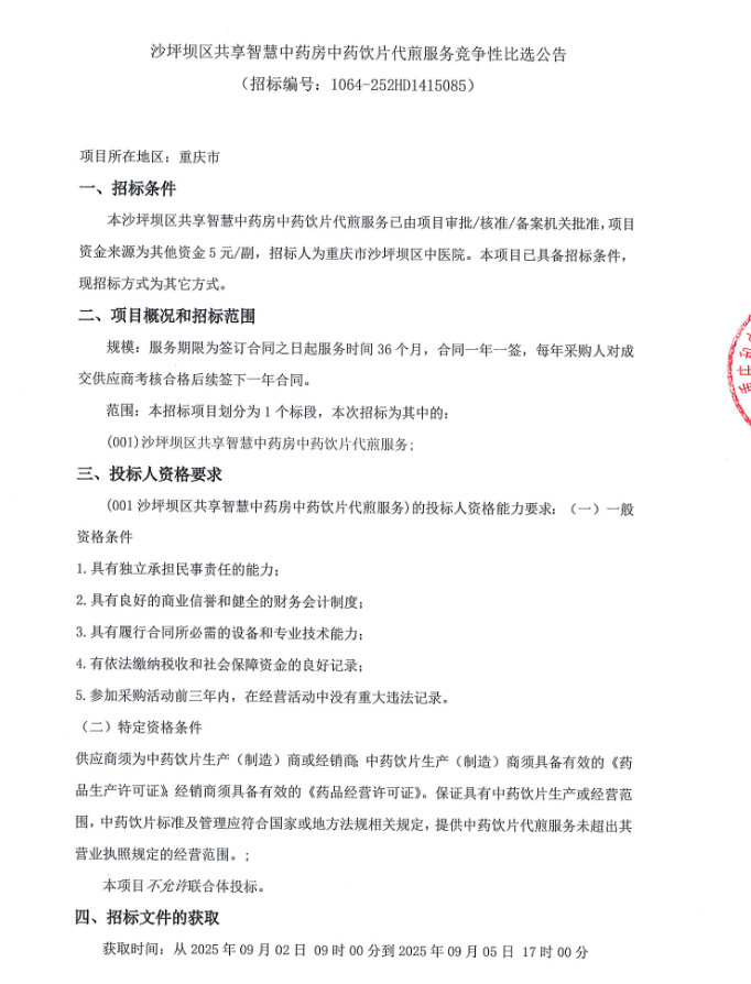 【重庆市沙坪坝区中医院】重庆市沙坪坝区共享智慧中药房中药饮片代煎服务竞争性比选公告
