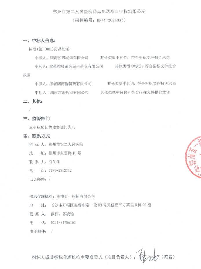 【郴州市第二人民医院】湖南省郴州市第二人民医院药品配送项目中标结果公示