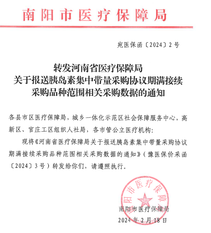 【南阳】转发河南省医疗保障局关于报送胰岛素集中带量采购协议期满接续采购品种范围相关采购数据的通知