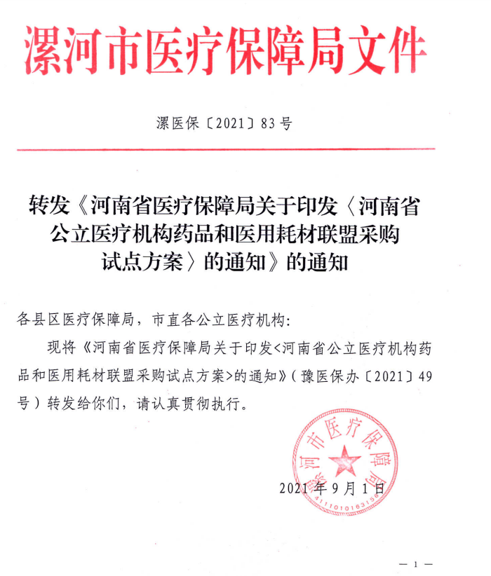 【漯河】转发《河南省医疗保障局关于印发<河南省公立医疗机构药品和医用耗材联盟采购试点方案>的通知》的通知