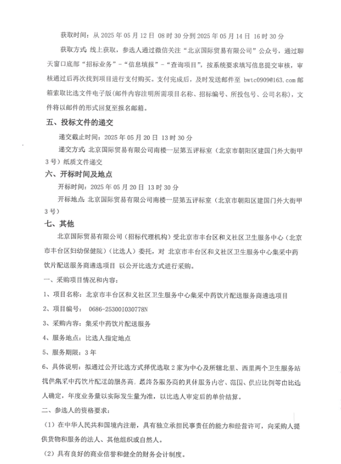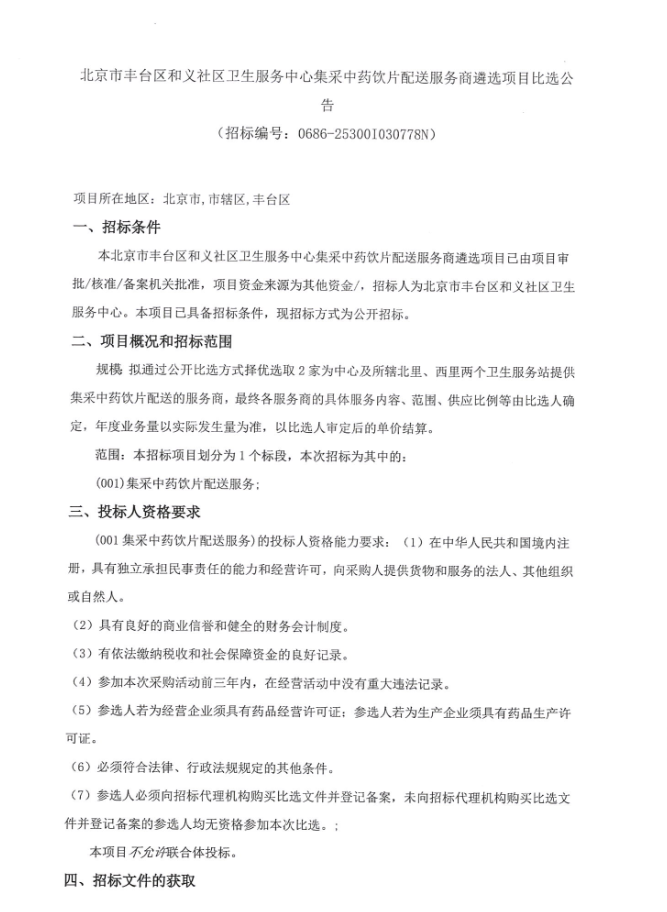 【北京市丰台区和义社区卫生服务中心】北京市丰台区和义社区卫生服务中心集采中药饮片配送服务商遴选项目比选公告