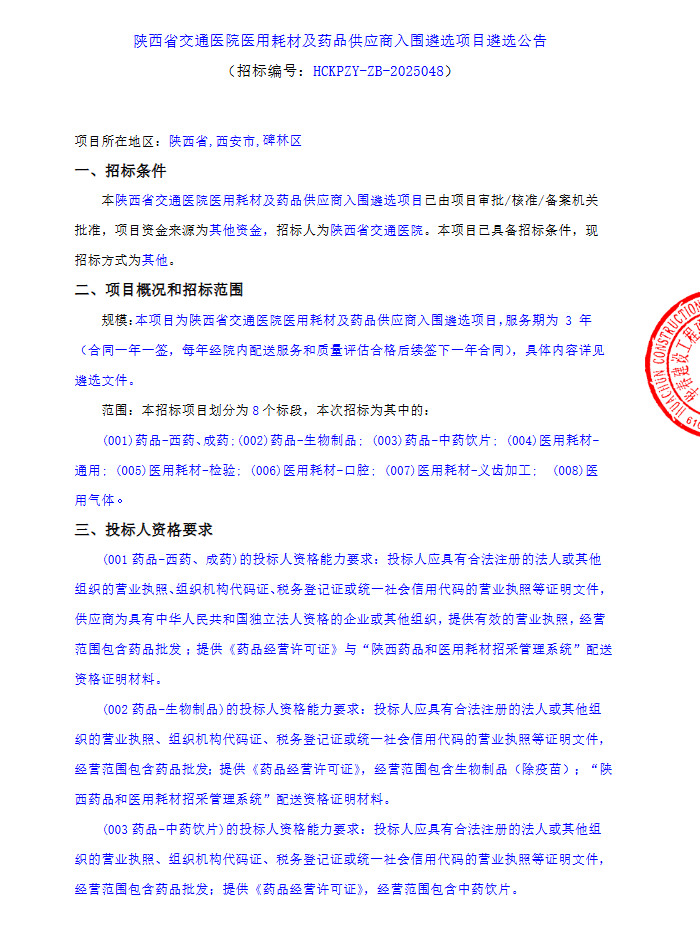 【陕西省交通医院】陕西省交通医院医用耗材及药品供应商入围遴选项目遴选公告