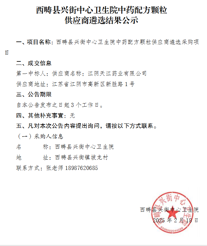 【文山壮族苗族自治州西畴县兴街中心卫生院】云南省文山壮族苗族自治州西畴县兴街中心卫生院中药配方颗粒供应商遴选结果公示