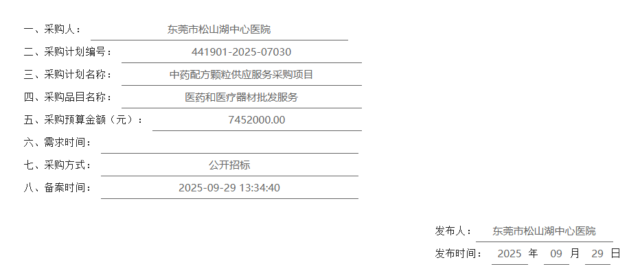 【东莞市松山湖中心医院】广东省东莞市松山湖中心医院中药配方颗粒供应服务采购项目
