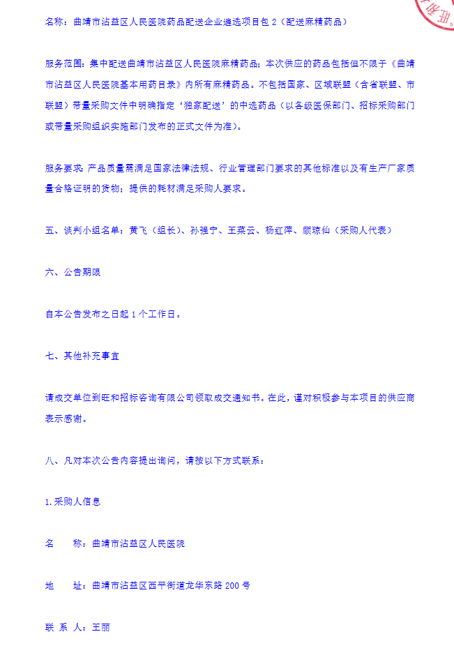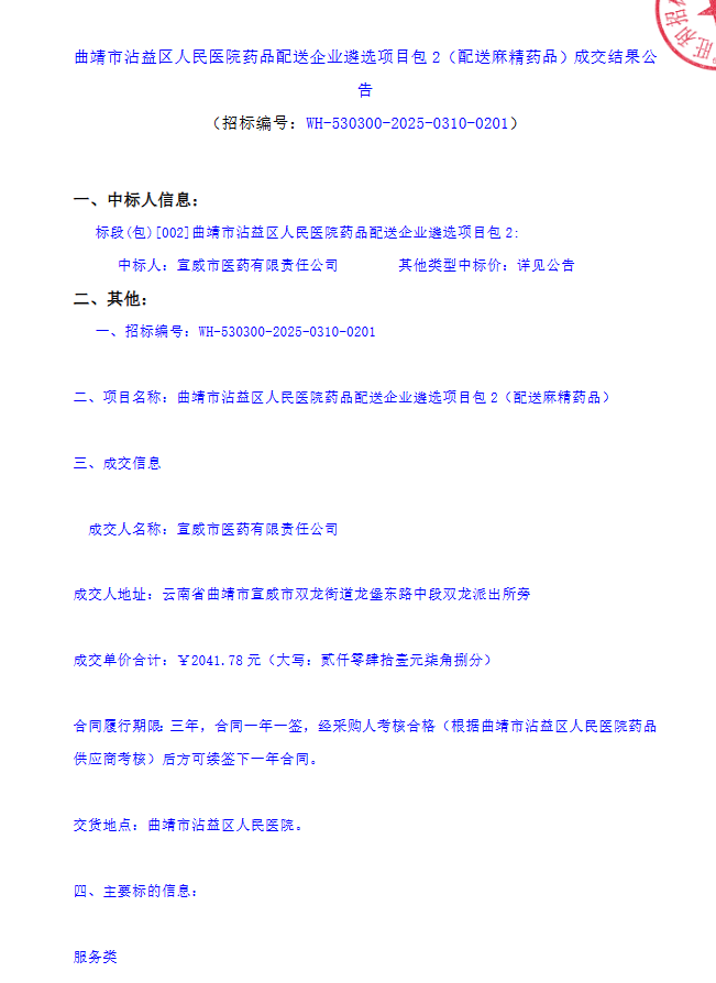 【曲靖市沾益区人民医院】云南省曲靖市沾益区人民医院药品配送企业遴选项目包2(配送麻精药品)成交结果公告