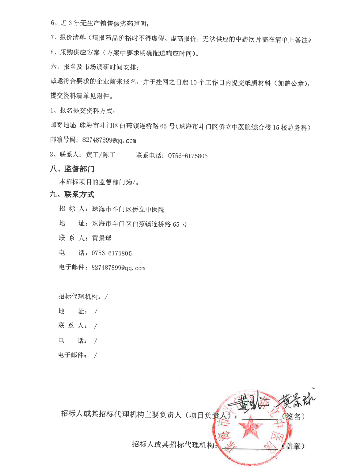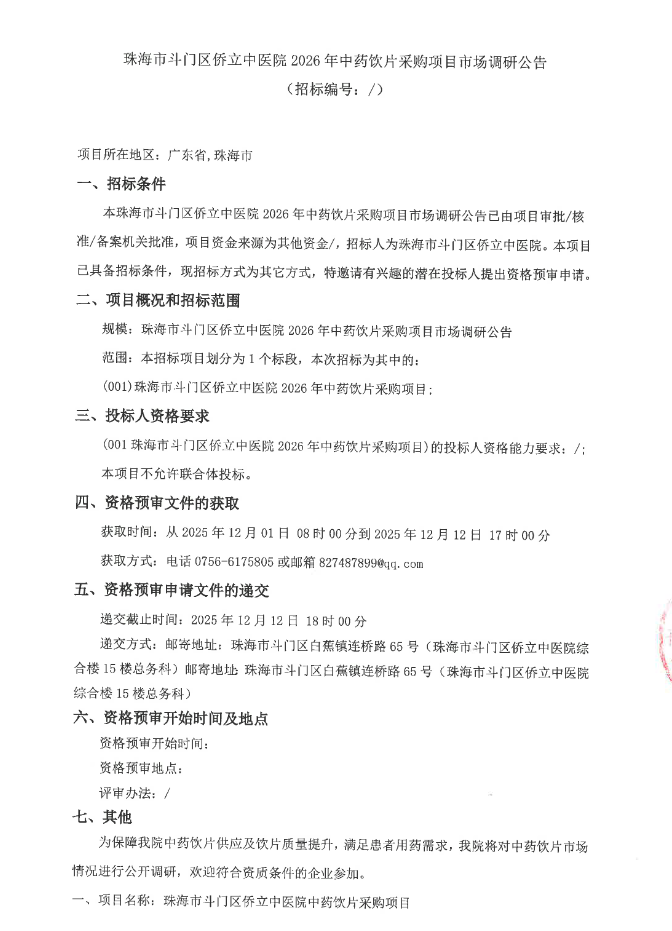 【珠海市斗门区侨立中医院】广东省珠海市斗门区侨立中医院2026年中药饮片采购项目市场调研公告