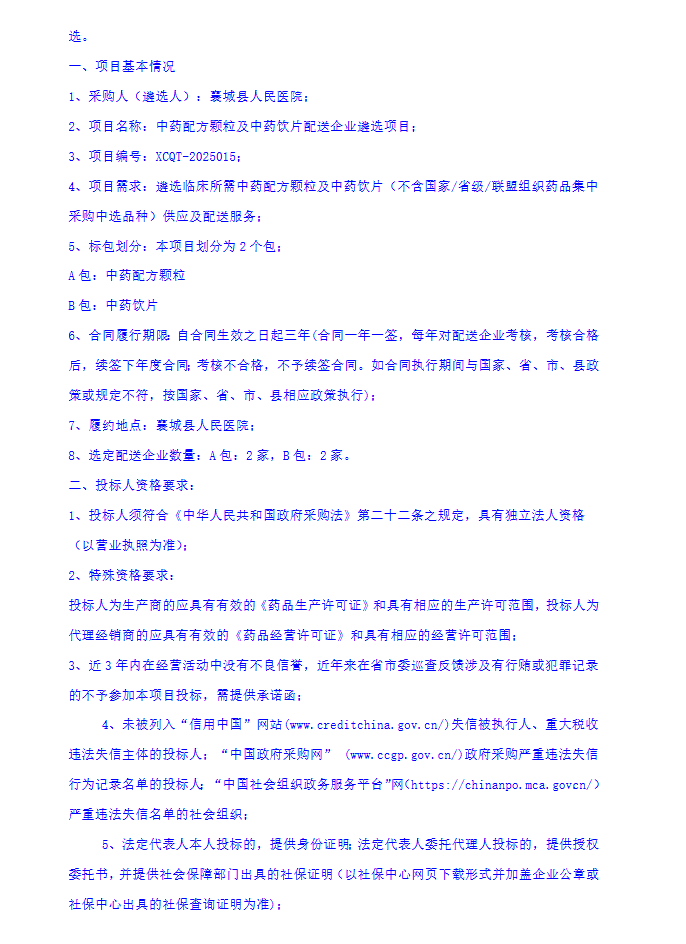 【许昌市襄城县人民医院】河南省许昌市襄城县人民医院中药配方颗粒及中药饮片配送企业遴选项目招标公告