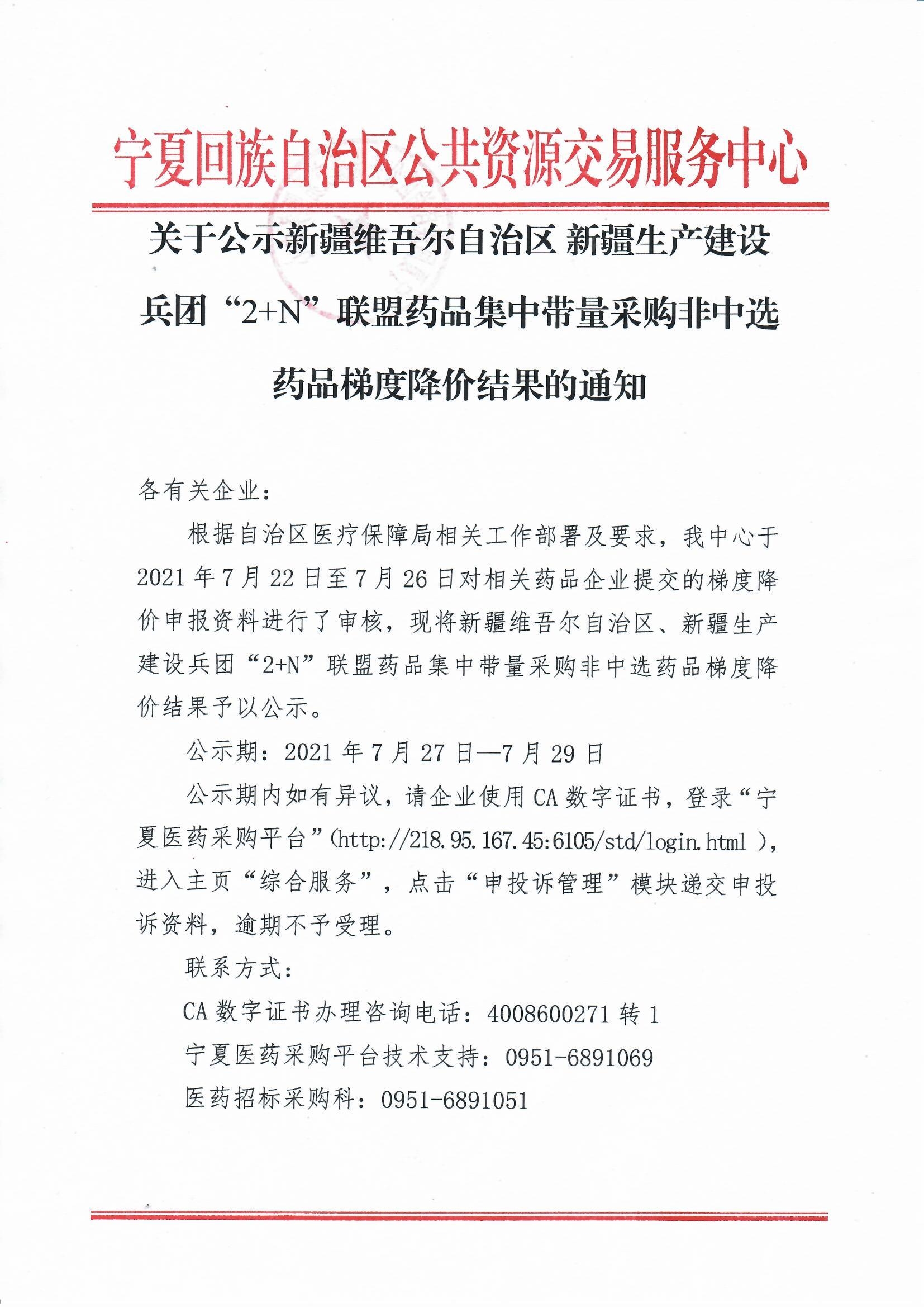 【宁夏】2021年宁夏自治区关于公示新疆维吾尔自治区新疆生产建设兵团“2+N”联盟药品集中带量采购非中选药品梯度降价结果的通知