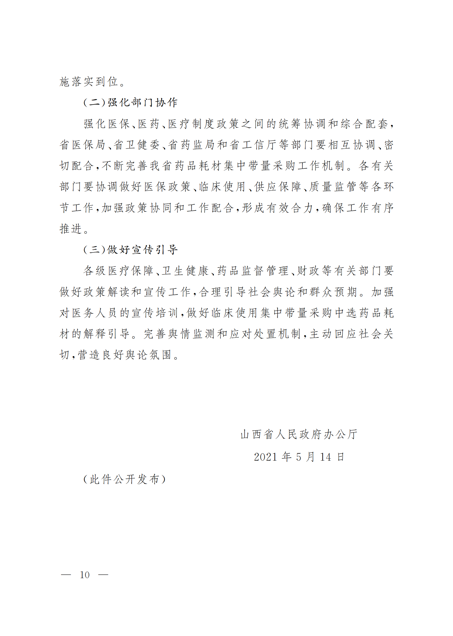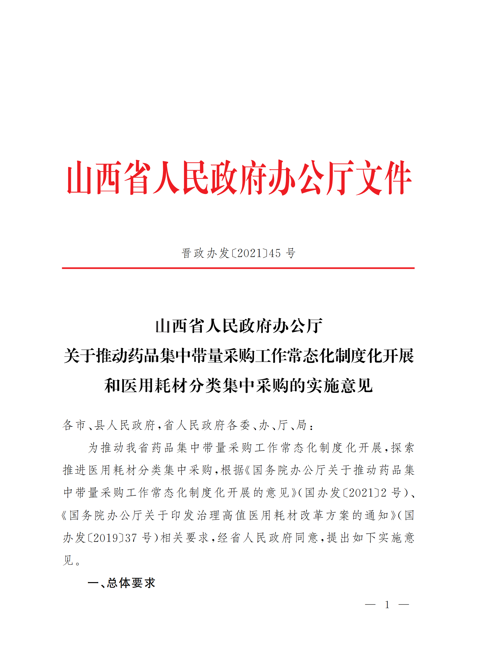 【山西】2021年山西省人民政府办公厅关于推动药品集中带量采购工作常态化制度化开展和医用耗材分类集中采购的实施意见 晋政办发〔2021〕45号