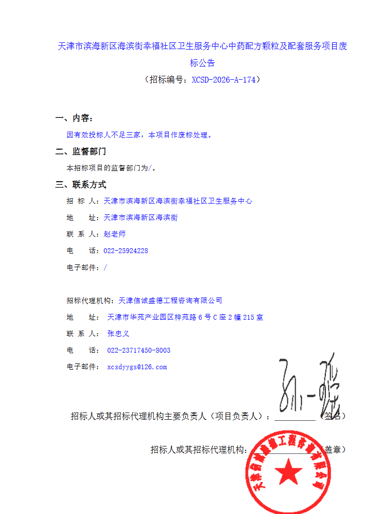 【天津市滨海新区海滨街幸福社区卫生服务中心】天津市滨海新区海滨街幸福社区卫生服务中心中药配方颗粒及配套服务项目废标公告