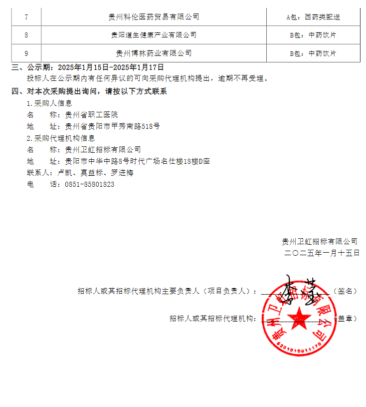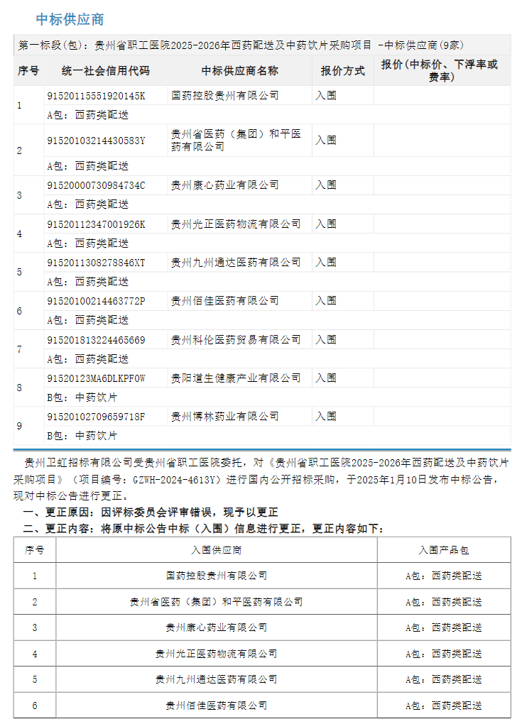 【贵州省职工医院】贵州省职工医院2025-2026年西药配送及中药饮片采购项目更正公告