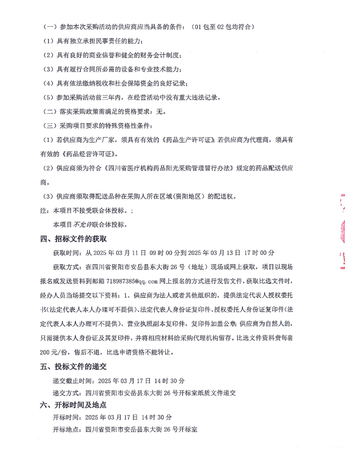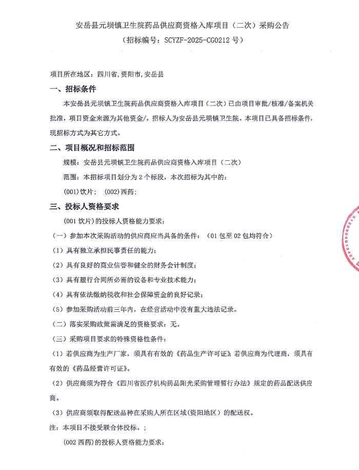 【资阳市安岳县元坝镇卫生院】四川省资阳市安岳县元坝镇卫生院药品供应商资格入库项目(二次)采购公告