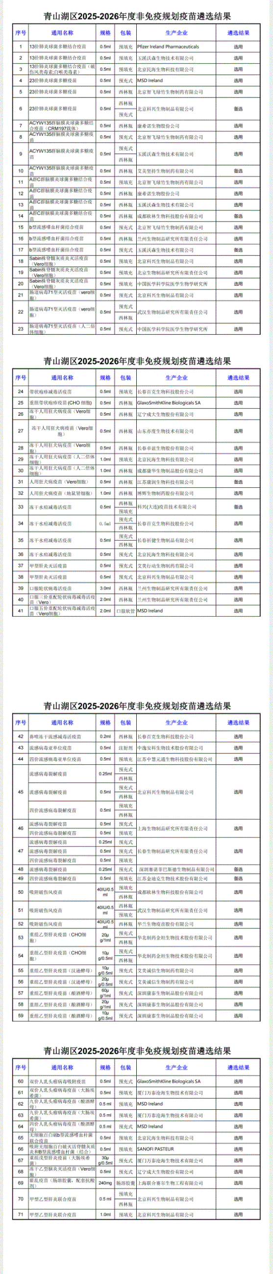 为规范我区非免疫规划疫苗的采购和使用管理,保障疫苗质量和供应,确保预防接种工作安全、有序开展,同时做好廉政风险防范,加强监督管理,保证非免疫规划疫苗采购工作公正、公开、规范有序地进行,青山湖区近期召开了非免疫规划疫苗遴选会,遴选出了《2025-2026年度青山湖区非免疫规划疫苗采购目录》,现将遴选结果予以公示(见下表),公示时间为2025年10月29日至2025年10月31日。