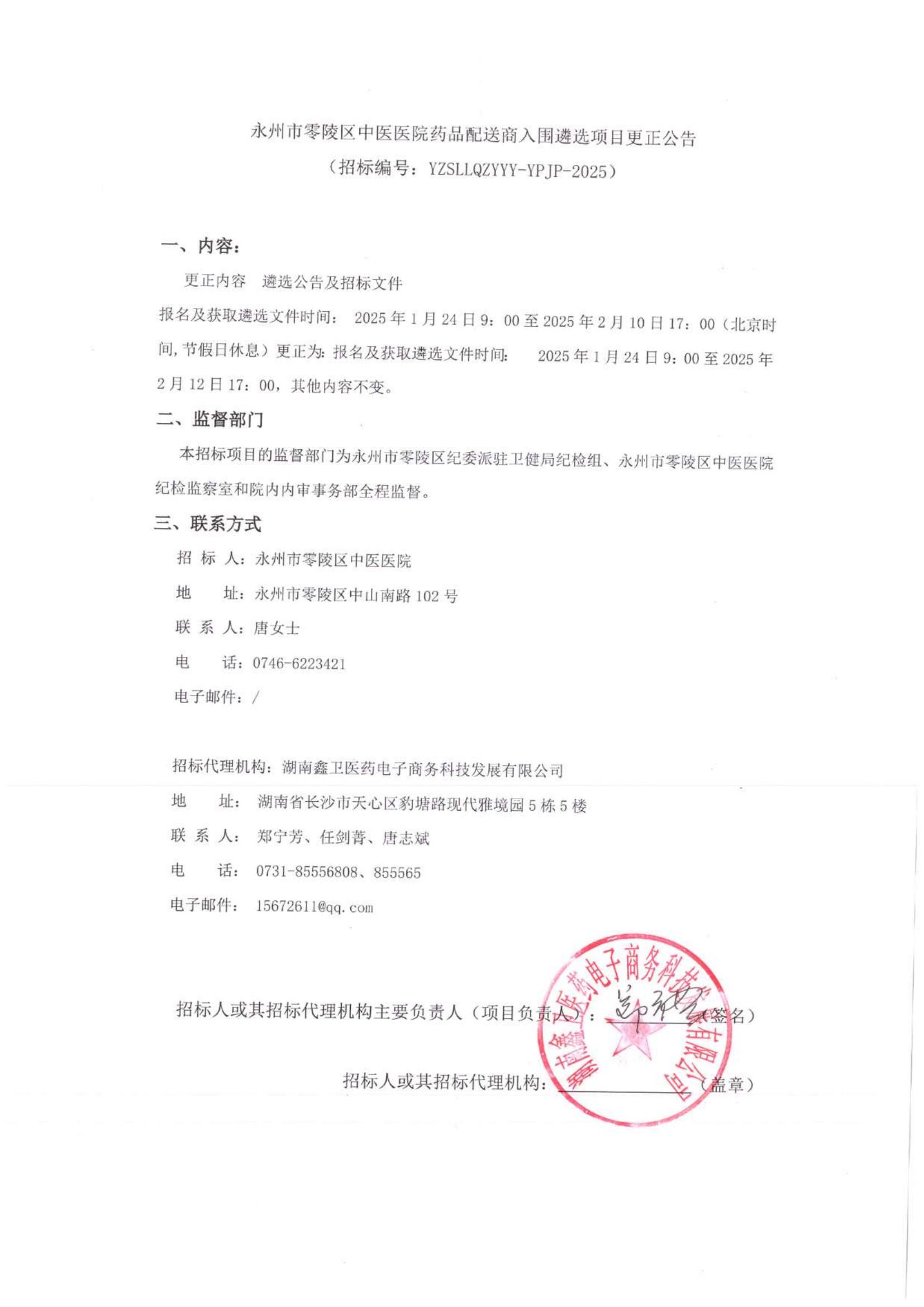 【永州市零陵区中医医院】湖南省永州市零陵区中医医院药品配送商入围遴选项目更正公告