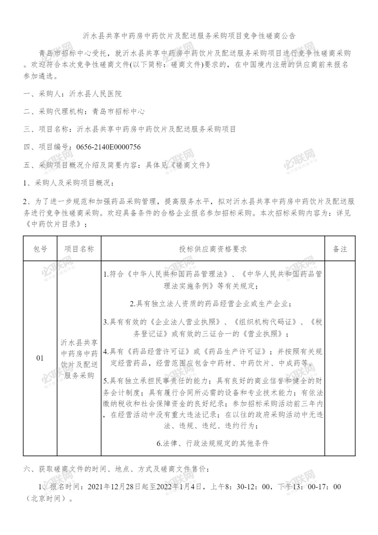 【临沂】山东省临沂市沂水县共享中药房中药饮片及配送服务采购项目竞争性磋商公告