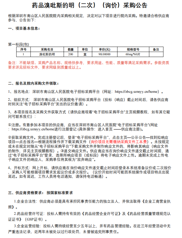 【深圳市华中科技大学协和深圳医院】广东省深圳市华中科技大学协和深圳医院药品溴吡斯的明(二次)(询价)采购公告