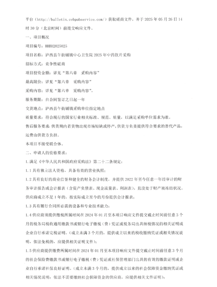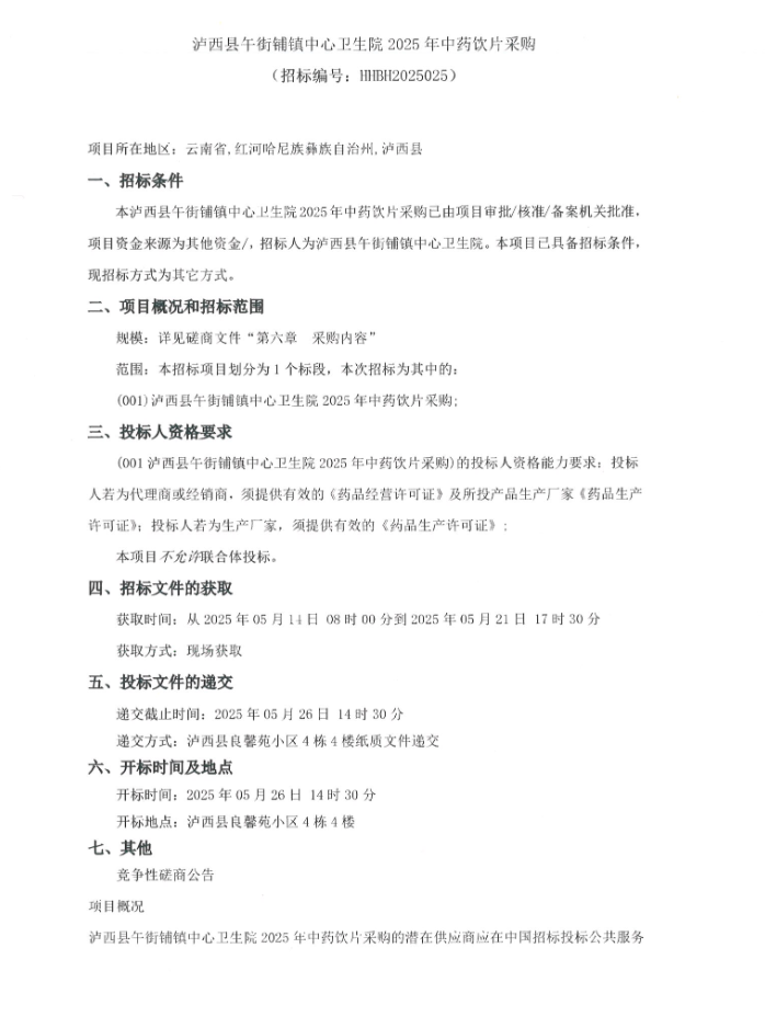 【红河哈尼族彝族自治州泸西县午街铺镇中心卫生院】云南省红河哈尼族彝族自治州泸西县午街铺镇中心卫生院2025年中药饮片采购