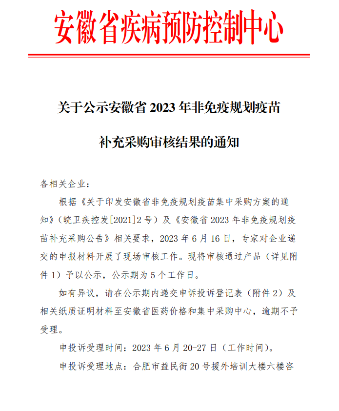 根据《关于印发安徽省非免疫规划疫苗集中采购方案的通知》(皖卫疾控发[2021]2号)及《安徽省2023年非免疫规划疫苗补充采购公告》相关要求,2023年6月16日,专家对企业递交的申报材料开展了现场审核工作。现将审核通过产品(详见附件1)予以公示,公示期为5个工作日。