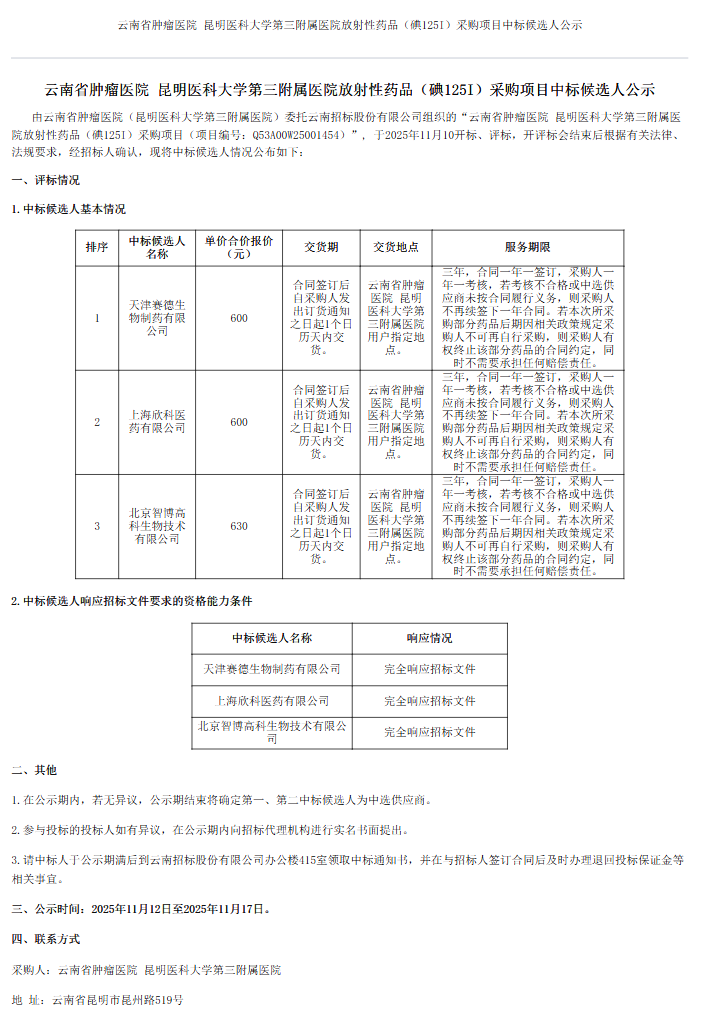 【云南省肿瘤医院】云南省肿瘤医院昆明医科大学第三附属医院放射性药品(碘125I)采购项目中标候选人公示