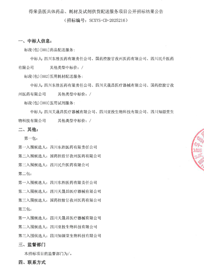 【甘孜藏族自治州得荣县人民医院】四川省甘孜藏族自治州得荣县医共体药品、耗材及试剂供货配送服务项目公开招标结果公告