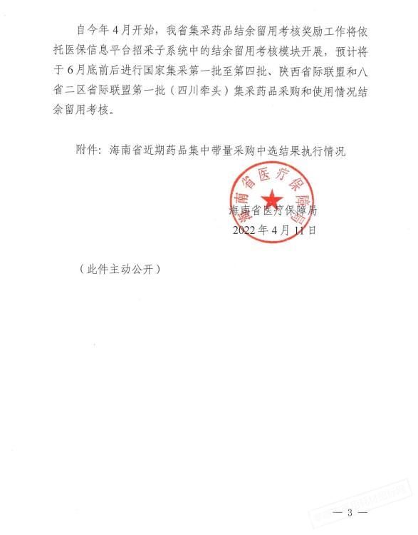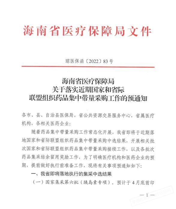 【海南】海南省关于落实近期国家和省际联盟组织药品集中带量采购工作的预通知(20220412)