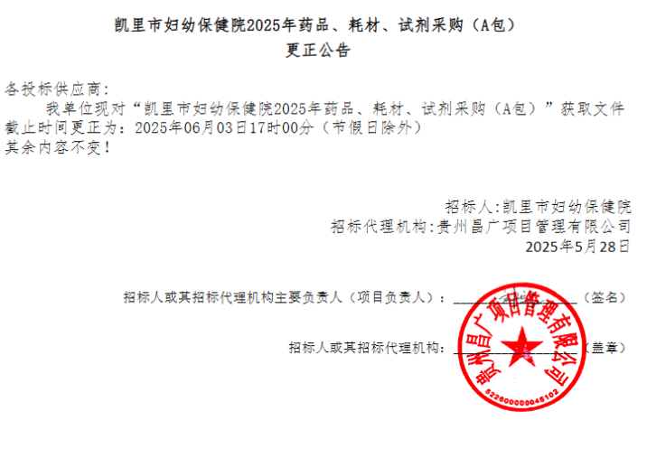 【黔东南苗族侗族自治州凯里市妇幼保健院】贵州省黔东南苗族侗族自治州凯里市妇幼保健院2025年药品、耗材、试剂采购(A包)更正公告