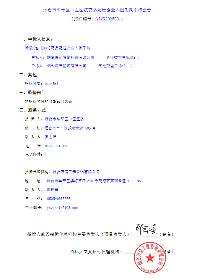 【烟台市牟平区中医医院】山东省烟台市牟平区中医医院药品配送企业入围采购中标公告
