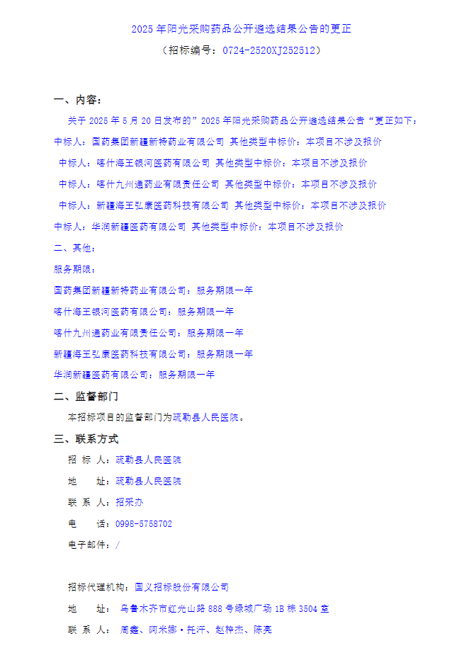 【喀什地区疏勒县人民医院】新疆维吾尔自治区喀什地区疏勒县人民医院2025年阳光采购药品公开遴选结果公告的更正