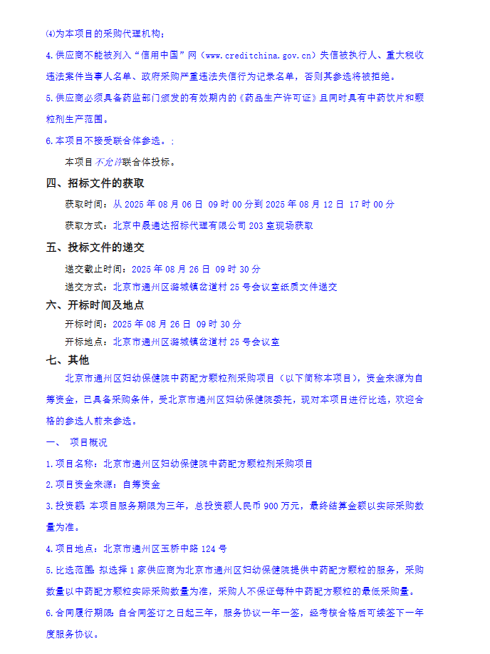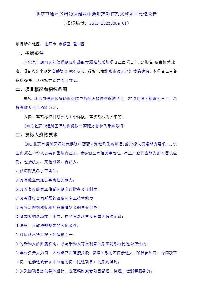 【北京市通州区妇幼保健院】北京市通州区妇幼保健院中药配方颗粒剂采购项目比选公告