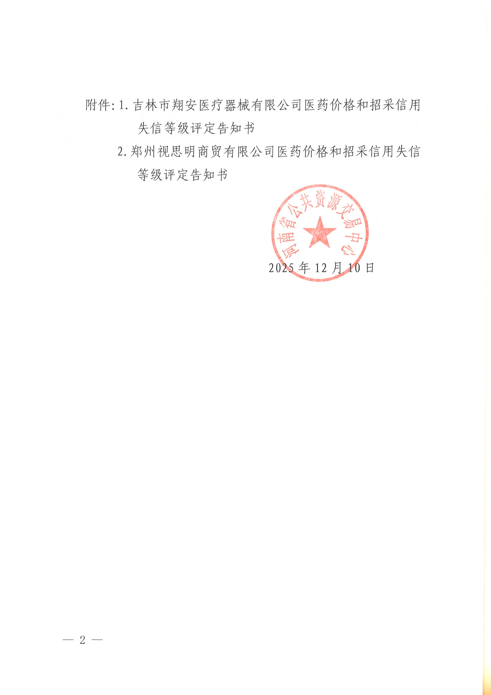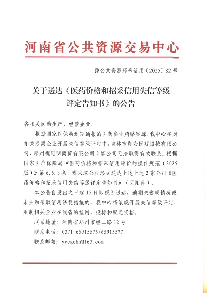 【河南】关于送达医药价格和招采信用失信等级评定告知书的公告