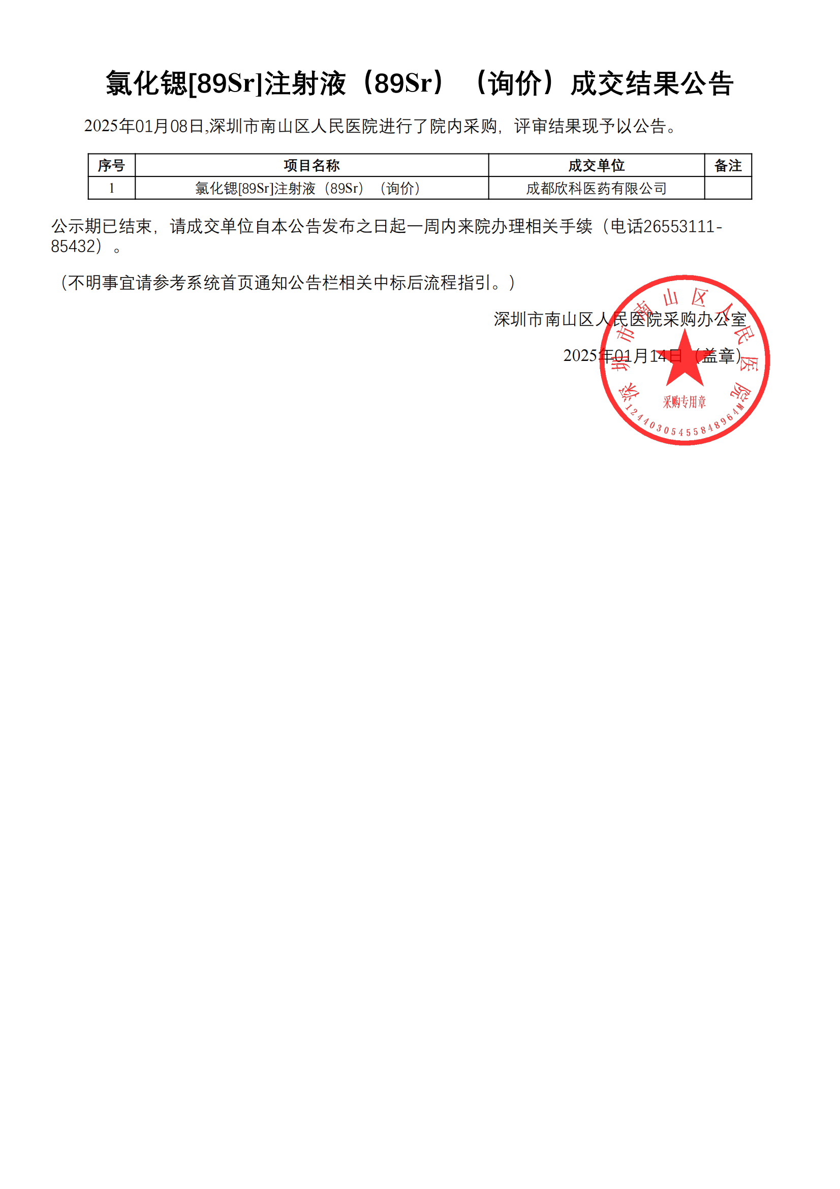 【深圳市华中科技大学协和深圳医院】广东省华中科技大学协和深圳医院氯化锶〔89Sr〕注射液(89Sr)(询价)成交结果公示