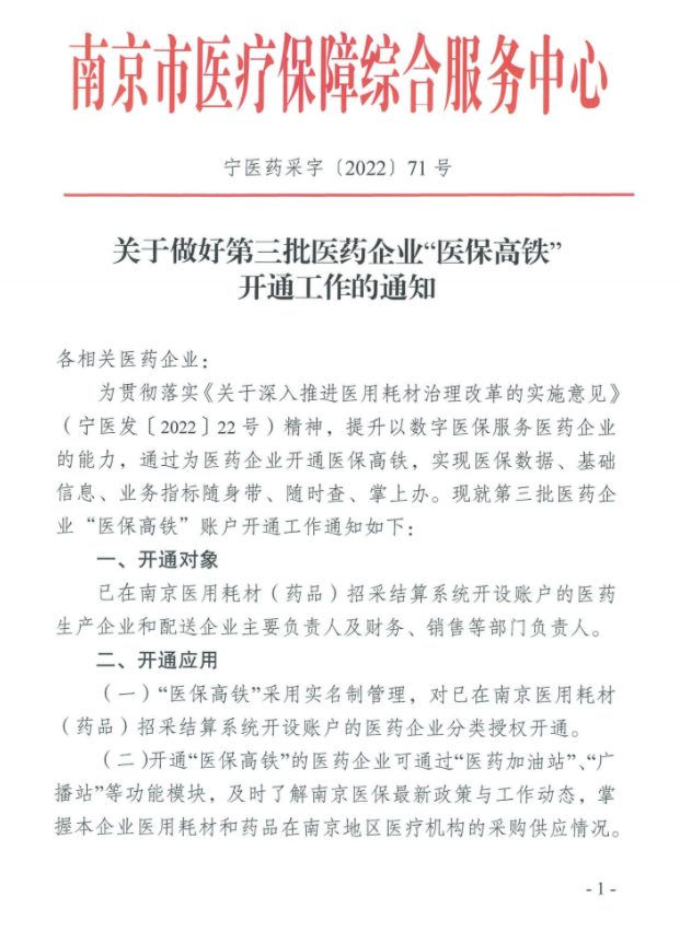 【南京】江苏省南京市关于做好第三批医药企业“医保高铁”开通工作的通知