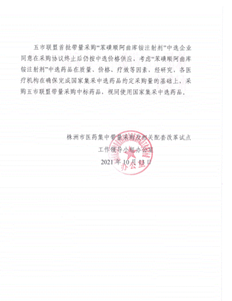 【株洲】湖南省株洲市关于终止五市联盟首批带量采购“苯磺顺阿曲库铵”“艾司奥美拉唑”“兰索拉唑”“多西他赛”“吉西他滨”中选药品采购协议的通知