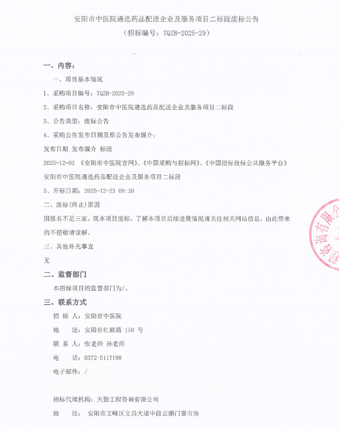 【安阳市中医院】河南省安阳市中医院遴选药品配送企业及服务项目二标段废标公告