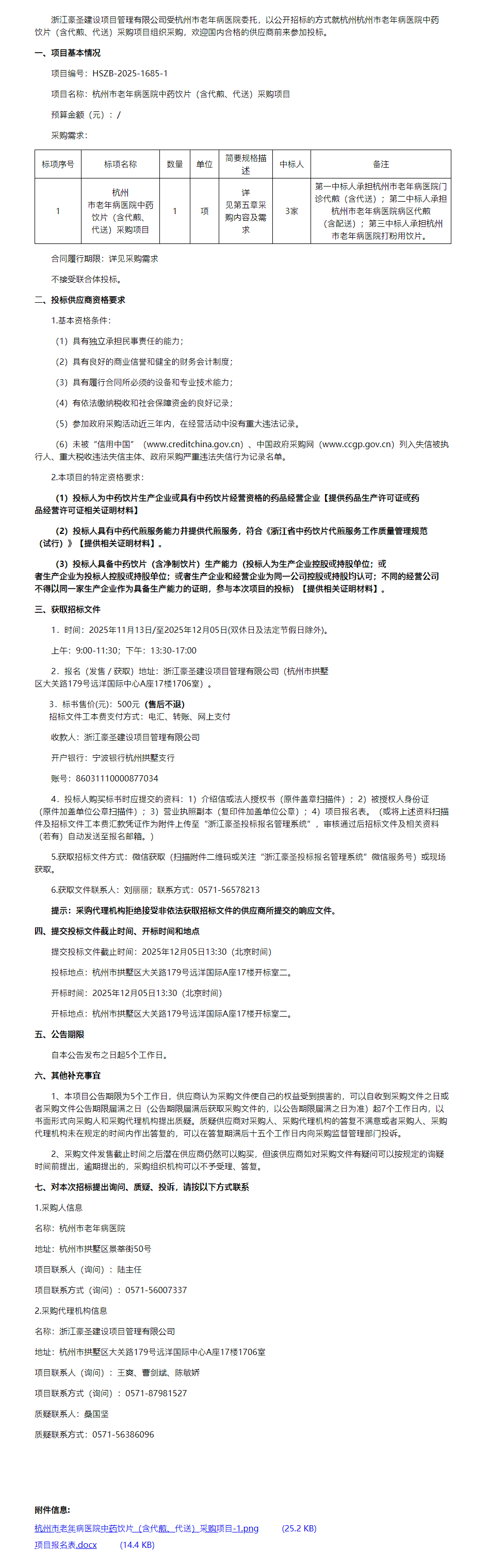 【杭州市老年病医院】浙江豪圣建设项目管理有限公司关于杭州市老年病医院中药饮片(含代煎、代送)采购项目的公开招标公告