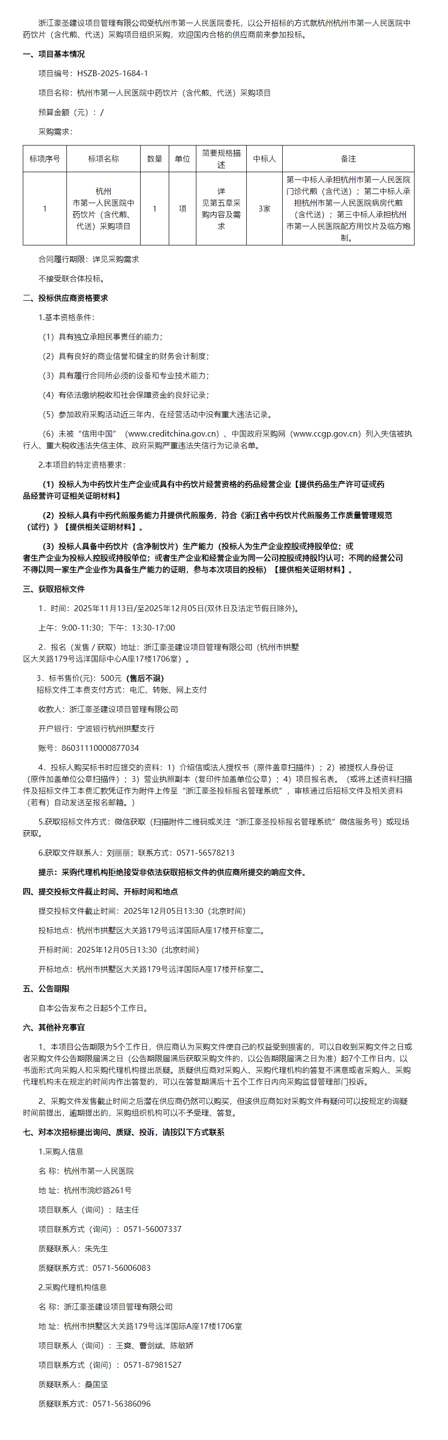 【杭州市第一人民医院】浙江豪圣建设项目管理有限公司关于杭州市第一人民医院中药饮片(含代煎、代送)采购项目的公开招标公告
